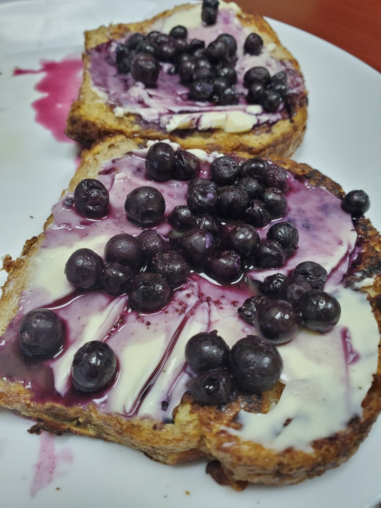Plate the toast and top each piece with a heaping tablespoon of whipped cream cheese and a tablespoon or two of the berry mixture. If you meal prep I like to get little containers to fill with the cream cheese and blueberries separately and then the day I eat it I reheat the bread in the toaster and the berries in the microwave and assemble it then.