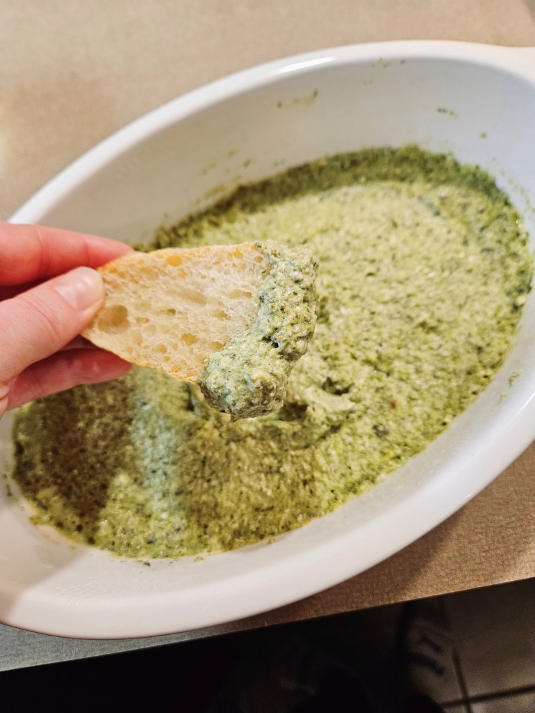 Sprinkle with remaining feta and serve! You can serve this with tortilla chips for ease, but I like to slice ciabatta bread into slices while waiting on the dip to heat and toast just for a few minutes in the oven to warm, right after I pull the dip out.